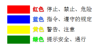 安全色是表達(dá)安全(quán)信息含義的顏色,表(biǎo)示禁止、警告、指令、提示(shì)等(děng),規定為紅、藍、黃、綠四色。