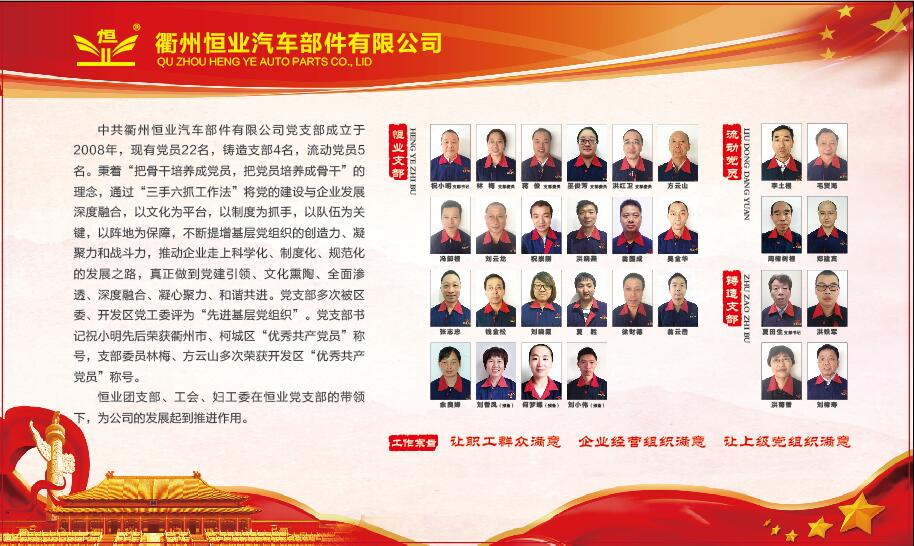 中共衢州91视频在线汽衢州91视频在线汽車(chē)部件有限公(gōng)司(sī)黨支部成立於2008年,現有黨員24名,鑄造(zào)支部4名,流動(dòng)黨員5名。秉著“把骨幹培養成黨員,把黨員培養(yǎng)成骨幹”的理念,通過(guò)“三(sān)手(shǒu)六爪工作法”將黨的建設與企業(yè)發展深度融合,以文化為(wéi)平台,以製度為抓手,以隊(duì)伍(wǔ)為(wéi)關鍵,以陣地為保障,不斷提增基層黨組織的(de)創(chuàng)造力、凝聚力和戰鬥力,推動企業走上科學化、製度化、規範化的發展之(zhī)路,真正做到黨建引領、文化熏(xūn)陶、全麵(miàn)滲透、深度融合、凝心聚力、和諧共進(jìn)。黨支部多(duō)次被(bèi)區委、開發區黨工(gōng)委評為“先進(jìn)基層黨組織(zhī)”。黨支部書記祝小明榮獲衢州市、柯城區“優秀(xiù)黨務工作者”稱號,支部委員林梅、方雲山、錢(qián)金鬆、蔣俊等榮獲開(kāi)發區“優秀共產黨員”稱號。黨員徐(xú)財德、祝崇剛(gāng)多次獲得(dé)市級職業技能(néng)大賽優異(yì)成績,91视频在线的技師團隊也全部來自支部黨員。